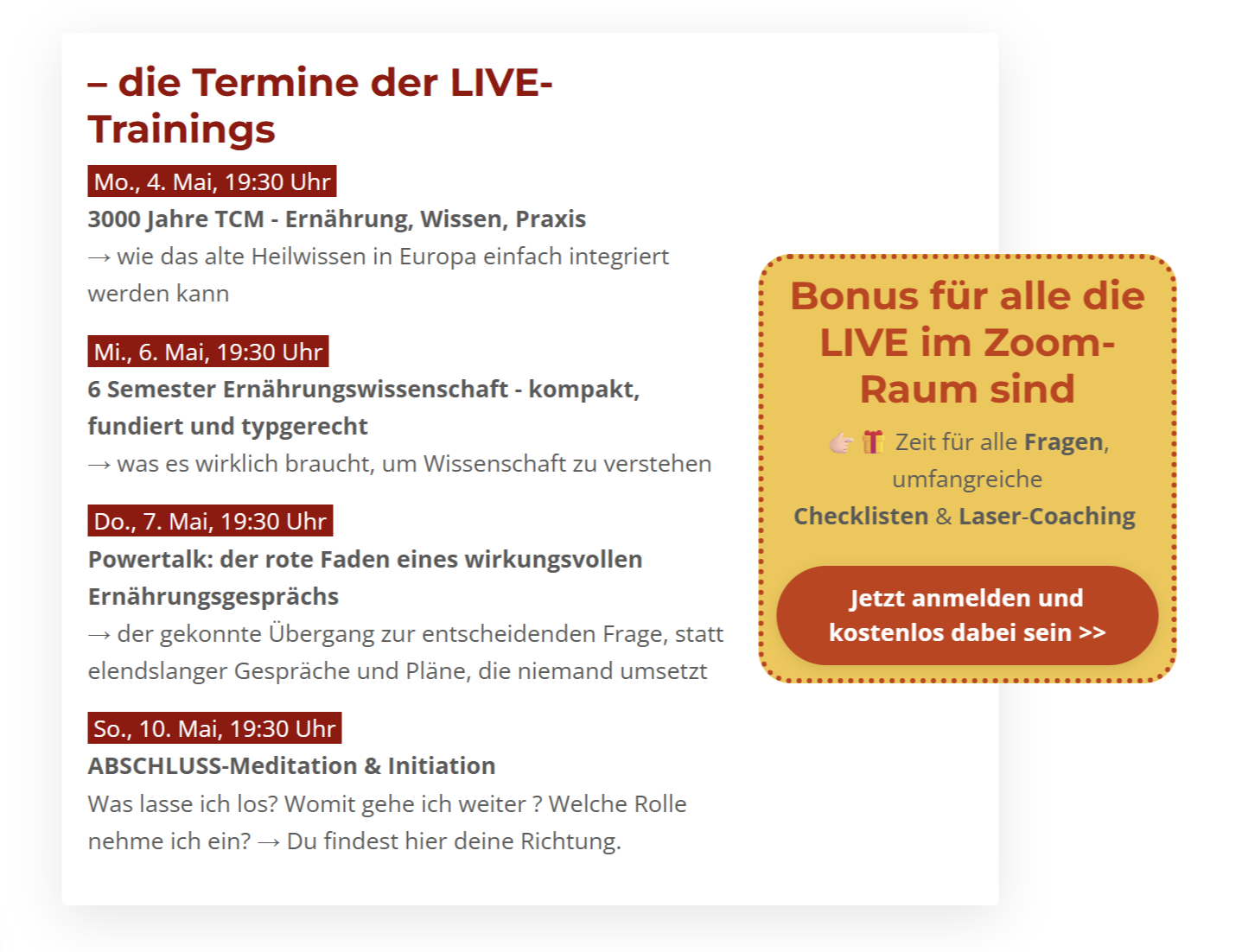 - eigene Herausforderungen mit der Ernährung lösen: Heißhunger, Hitzewallungen, Kinderwunsch, Entzündungen, Verdauungsprobleme, Allergien, Unverträglichkeiten, Wechseljahres-Beschwerden, Übergewicht, Kältesymptome, Sodbrennen, Müdigkeit, Herz-Kreislauf-Probleme, Schlafstörungen, ...