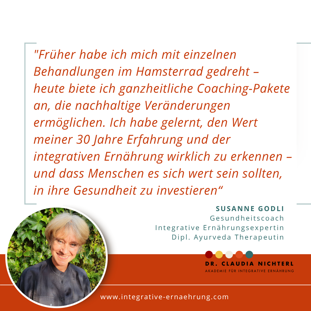 "Früher habe ich mich mit einzelnen Behandlungen im Hamsterrad gedreht – heute biete ich ganzheitliche Coaching-Pakete an, die nachhaltige Veränderungen ermöglichen. Ich habe gelernt, den Wert meiner 30 Jahre Erfahrung und der integrativen Ernährung wirklich zu erkennen – und dass Menschen es sich wert sein sollten, in ihre Gesundheit zu investieren“